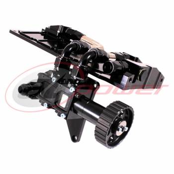 The Oil Pump with its extended nose and mounting plate is positioned on to the inlet side of the engine block in the existing Air Con location, being driven via the Crankshaft Pulley and HTD Drive Belt supplied. This system retains Fords original (OEM) high efficiency variable displacement Oil Pressure Pump which is directly fed from a remote Oil Tank. The Oil Pumps supply and return hose connections are JIC-12 and we recommend a minimum of a 5-litre Oil Tank and either an air type Oil Cooler with a minimum 18 rows or a Laminova type Oil Cooler.